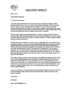 Licensing and Chemicals Granite Shield is a sealing service company and not a chemical company. All applicators are licensed as a Granite Shield sealing service applicator whether they are a granite fabricator and only seal granite they fabricate or a full sealing service sealing all the hard surfaces in the home Granite Shield offers. Chemicals are prepaid in advance for services provided based on sq. ft. pricing. Distributors and applicators that have territories their monthly minimums are their continued monthly licensing fee to maintain a territory. Distributors and applicators with no territory there is no continued licensing monthly minimums. Applicators are independent contractors and not employees of Granite Shield. Granite Shield has suggested retail pricing but applicators prepaying for the sq. ft. to be sealed in advance have the option such as a granite fabricator to include the Granite Shield process in the sq. ft. of granite they fabricate or pricing below or over the Granite Shield suggested retail price. Prices are not price fixed. Granite Shield Applicator Sample Starter Kit Granite Shield Available Contracts |