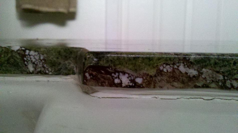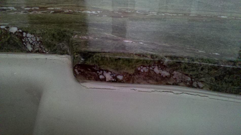 Example of cracked caulking between sink & granite dirty, greasy dishwater penetrating from crack to surface (Not a Granite Shield Warranty Should Water Penetrate or Stain from Crack) Caulking and grout is the responsiblity of the customer |